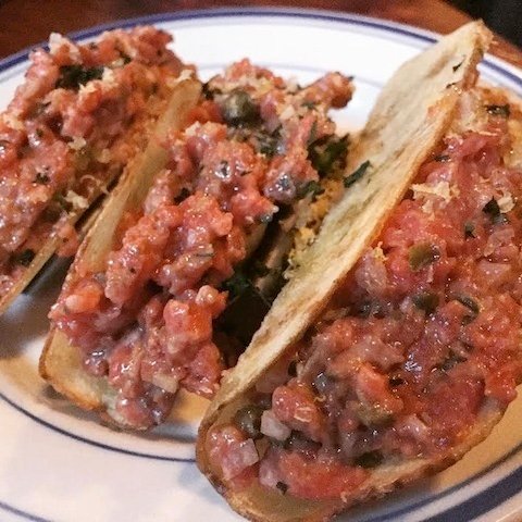 You’ll definitely want to get the Steak Tartare tacos at Hampton + Hudson. The shell is no wimpy tortilla. It’s a sturdy potato chip shell. Why has no one ever thought of this before? And these are 100 percent full of tartare. No filler toppings, which makes them a very filling sharable plate. Again, it’s served as a trio, so you’ll have to fight over this one too. Or just order two.