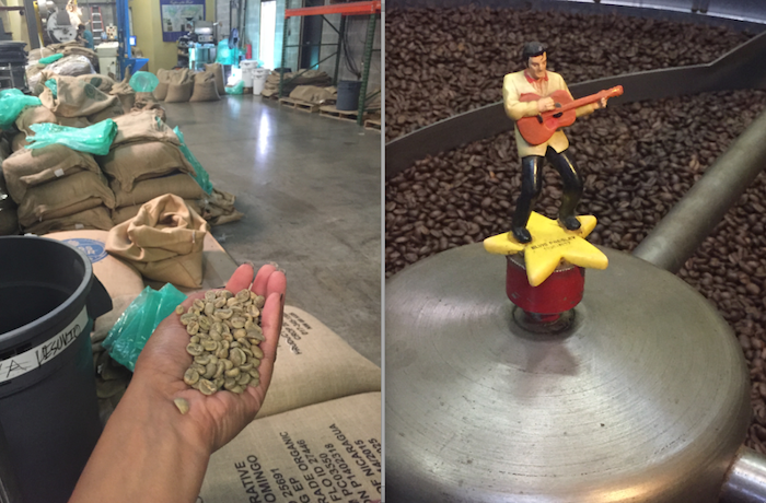 L: Unroasted beans, R: Elvis oversees coffee production at Batdorf and Bronson