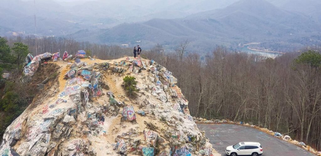 Unrestricted 360-degree views of the Appalachian Mountains in north Georgia. Below, the vast Chatuge Lake, studded with islets, extends far into the horizon. Bell Mountain is one of Georgia’s most beautiful views. It may, however, be the saddest mountain you’ve ever seen.