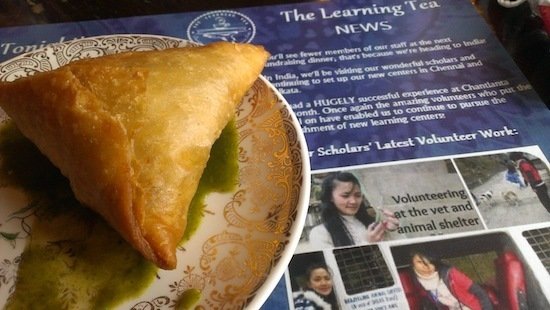 Samosa at Dr. Bombay’sOnce a month they have fundraisers at the tea house in Atlanta. For $20 per person, we were treated to wine (nothing fancy – the Two Buck Chuck variety) and appetizer and vegetarian entree. Makeshift tables are pulled together to accommodate the filled to capacity (about 40 people) room. While wine was readily available, most seemed to prefer the iced Darjeeling tea to wash down the savoy, spicy food. Chana Masala and Aloo Gobi were served for dinner. Dr. Bombay’s sells packs of tea and other items to raise funds for their charity work. The dinners take place the last Monday of each month.