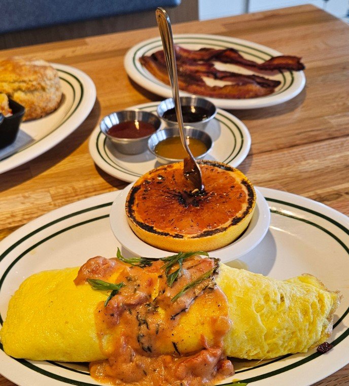 Then there’s the show-stealer if you like your eggs with drama: the Creole Omelet. Shrimp and andouille bring the smoky, briny backbone, with onion, tomatoes, and cheddar folded in, then the whole thing gets topped with tomato gravy and scallions. It reads indulgent because it is, but it’s also balanced in a way that keeps you going back for another bite. This is not a timid omelet. It’s a dish with a point of view.