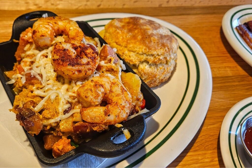 The Low Country Skillet is a full-on Southern breakfast statement. It’s the kind of dish that understands why cast iron matters and why brunch should feel warm and grounding. While the exact build can vary by location, the Low Country idea stays consistent: coastal Southern comfort, built to be rich, hearty, and fork-worthy.