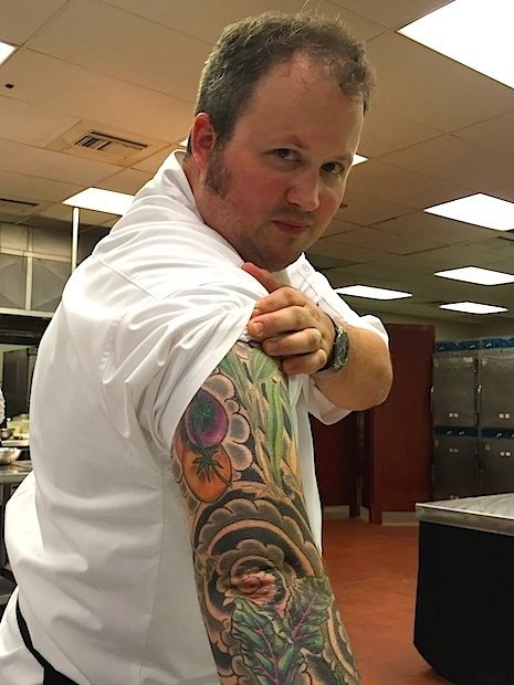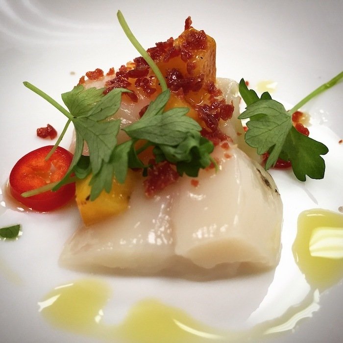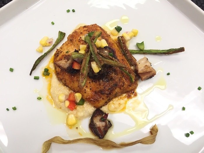 Let’s be honest. When it comes to Catfish, it doesn’t come to mind when you think about fine dining, right? But look what Chef Nick did with it? He paired with Pork Belly (who doesn’t love that?), creamed corn plus a roasted red pepper Harissa. Oh and those Okra Crisps? They weren’t just a pretty garnish. I gobbled them up! Chef Walker really likes vegetables as you can see below: