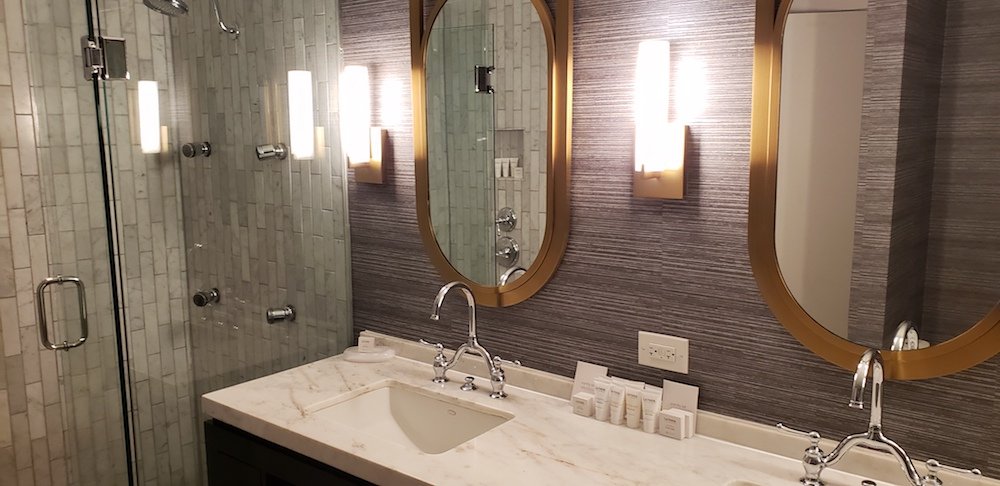 But the prettiest part of the suite is the bedroom / bathroom. Modern gray color scheme with metal touches completes the room. A curved and textured half wall covers half the room. I especially liked the built in ottoman that was more than ample to set my luggage. No throwing the suitcase on the floor or using the folding rack to precariously set it on. The metal “pipes” in place of a closet was a interesting too. Watch my instagram reel here.