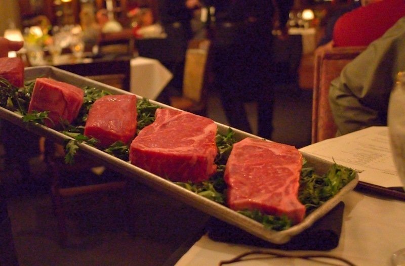 Before you choose your entree, servers come around with a tray of uncooked steaks, to show diners the different cuts of steak and the various sizes and marbling. Nice touch. There are many tempting options – the 12 oz NY Strip?, the 14 oz Ribeye?, or an 18 oz Kansas City Strip? In the end, I went with the Ribeye and had no regrets.