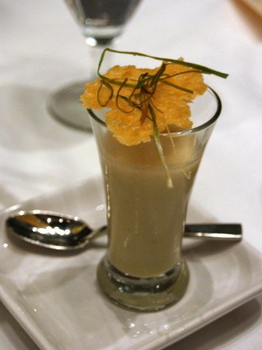 But enough about the renovations, you should see the food we got! Course 1 was the Potato Bisque with leeks. It was served with a parmesan cracker and taken like a shot instead of sipped on.