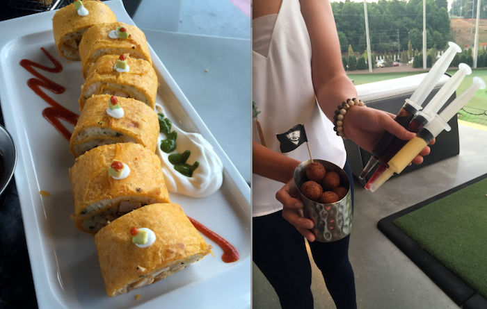 This two-story spot has games and large dining area on the first floor and the top is…well golf. There are portioned off seating areas for groups, so the experience is as much as social or even more so than it is about the golf. Max number for seating area is six. Our group was comfortable and had plenty of space, even with the obscene amount of food and drink placed in front of us.